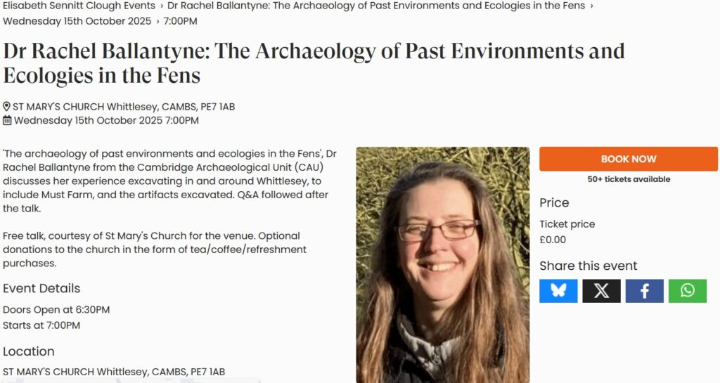 Dr Rachel Ballantyne will be giving a talk on ‘The Archaeology of Past Environments and Ecologies in the Fens.