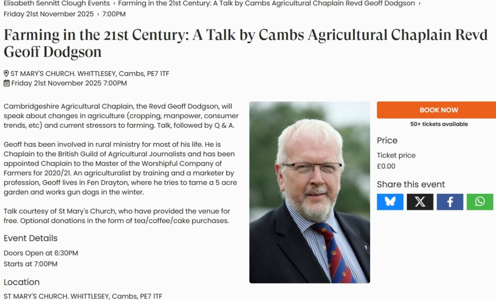 On 21st November, Cambs Agricultural Chaplain, Revd Geoff Dodgson will be giving a talk on Farming in the 21st Century.