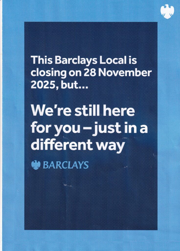 Being a customer of Barclays for over 65 years, I too am sorry to see them and others stopping face-to-face support locally.