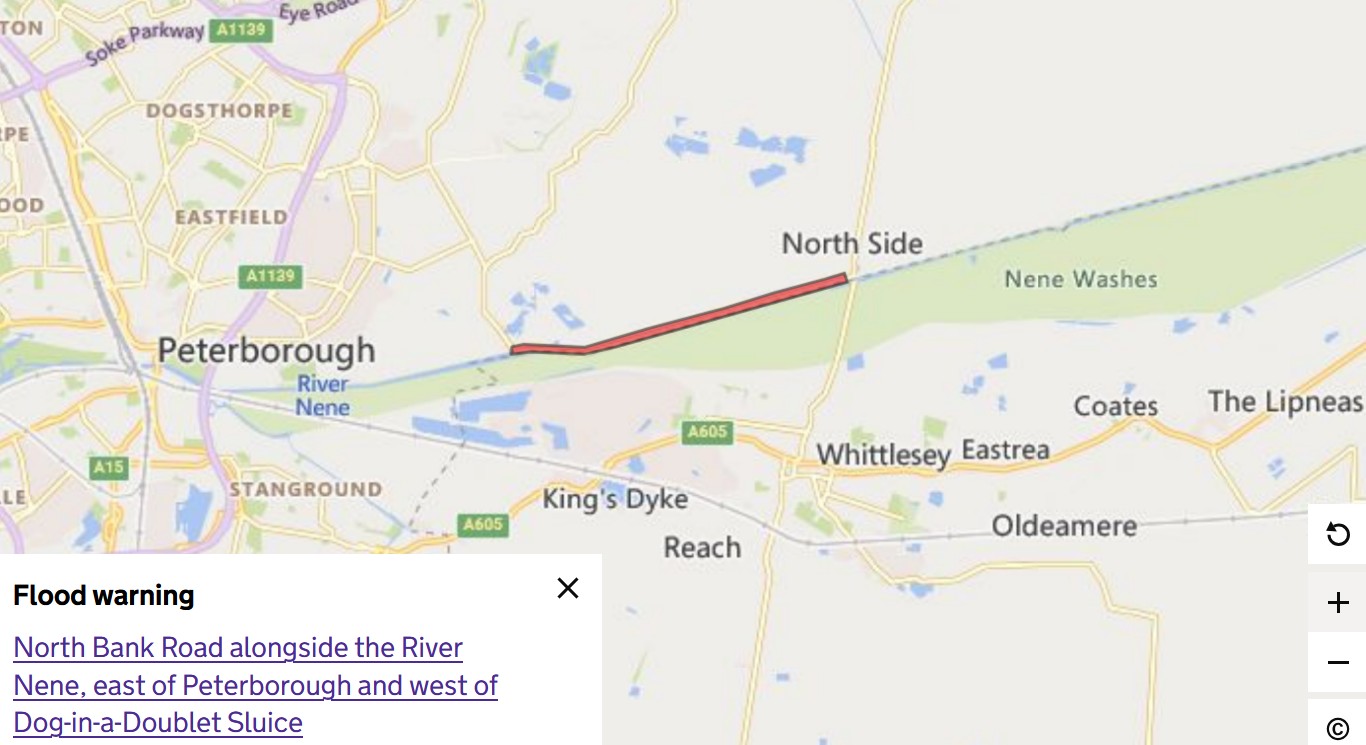 Flooding is expected for: North Bank Road alongside the River Nene to the east of Peterborough and the West of the Dog-in-a-Doublet Sluice