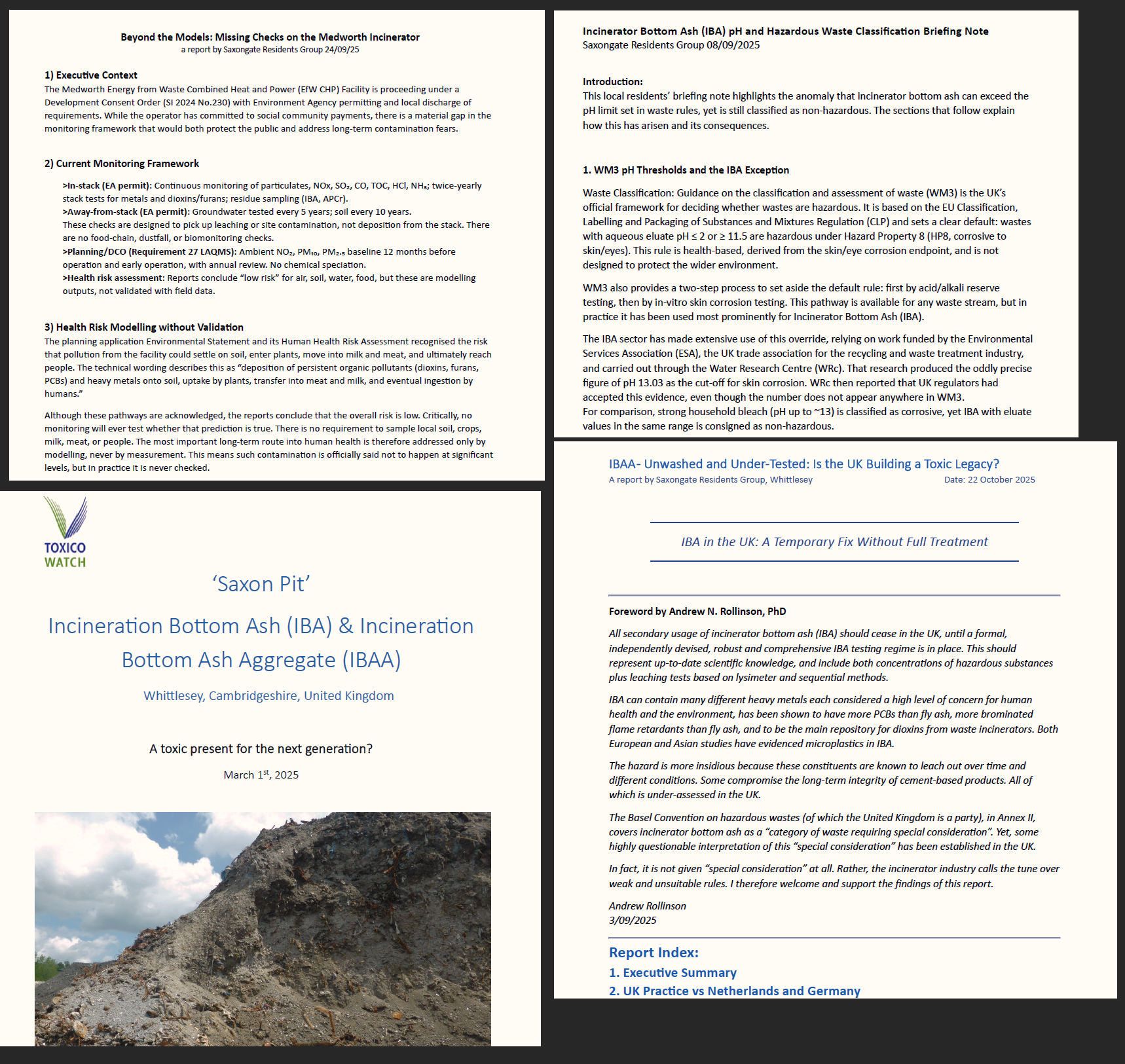 The work links local experience at Saxon Pit to wider national issues around how incinerator residues are processed, tested and regulated in practice. It draws on public data, regulatory frameworks and international practice, with direct expert input and an independent review.