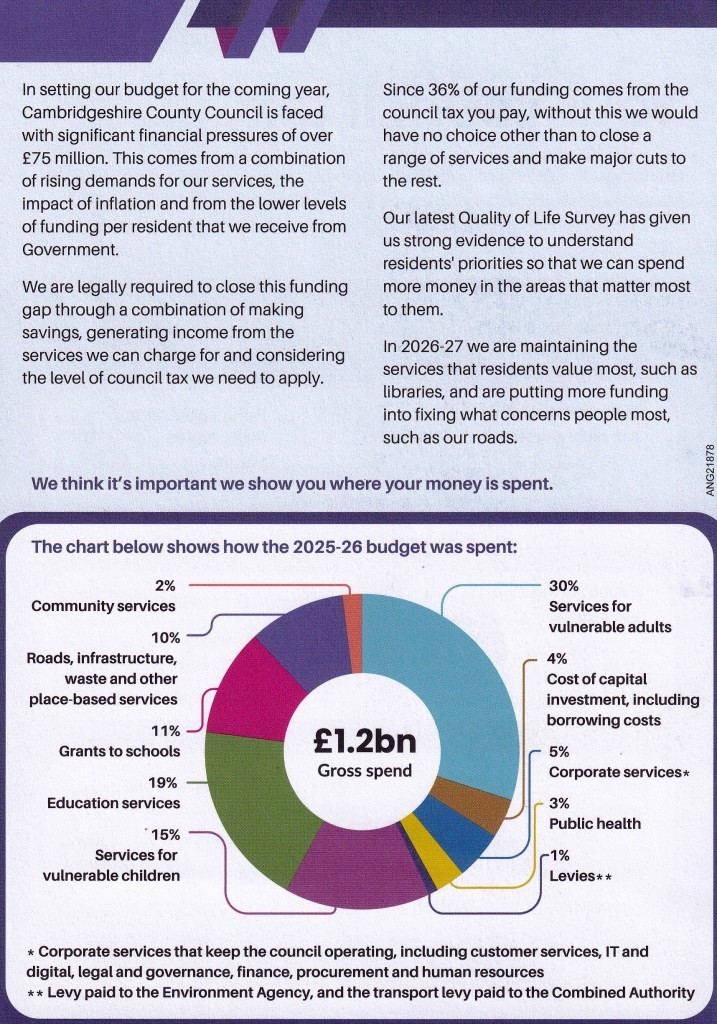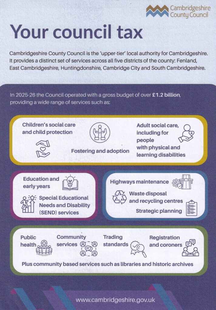 Most if not all increases are going to Cambs County Council – Fire & Rescue Service and Police…..Fenland District and Whittlesey Town Council have not increase their share for some 8 years….to which I have supported throughout…