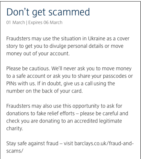 The message above is a scam warning from Barclays but is relevant whoever you bank with.